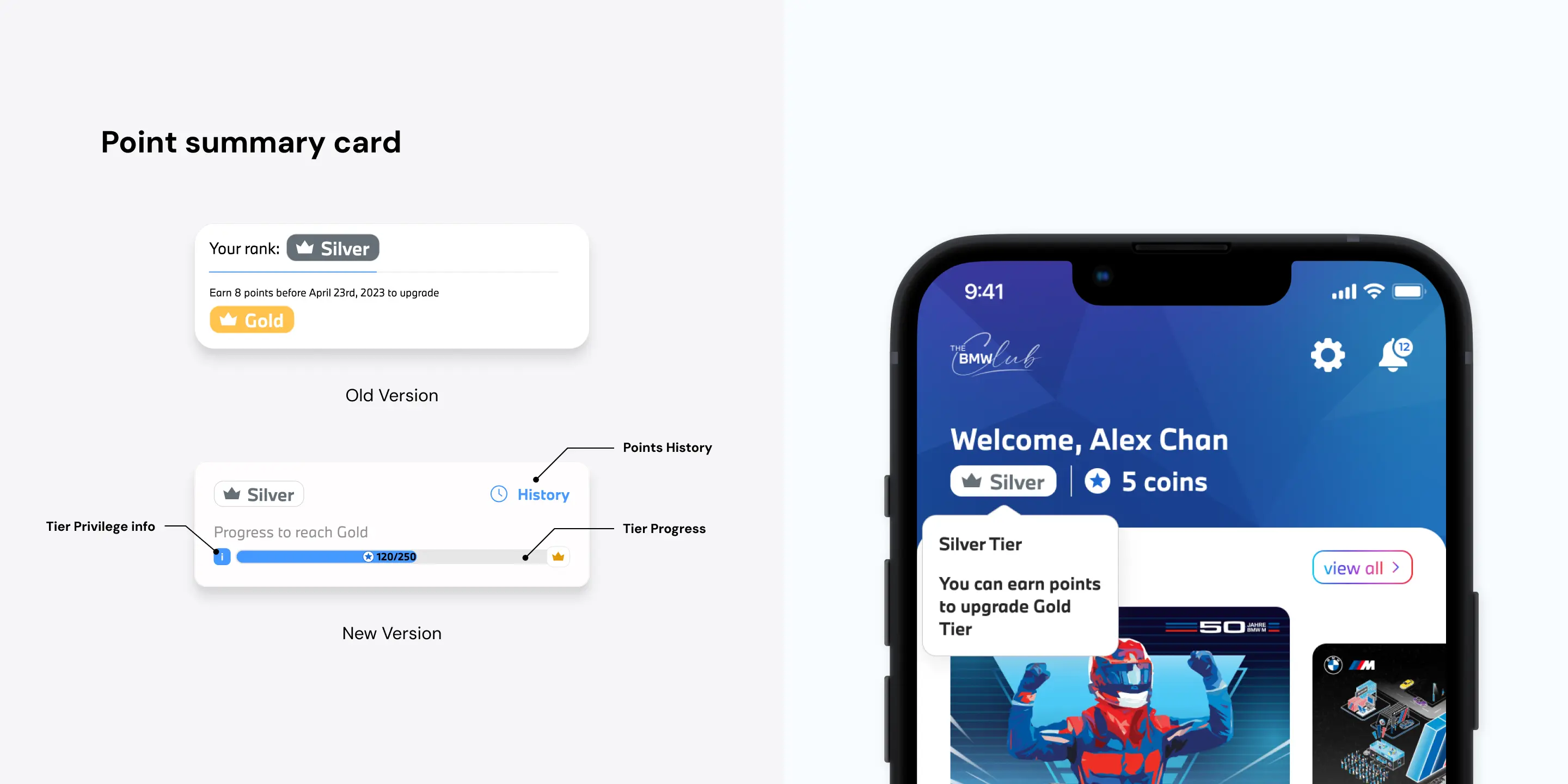 I established more interactive components across the design. For instance, users could tap on a tier label (e.g., “Silver”) to see related tips and information. This approach made it easier for users to understand the mechanisms behind tiers, privileges, and point earning without overwhelming them with excessive text.